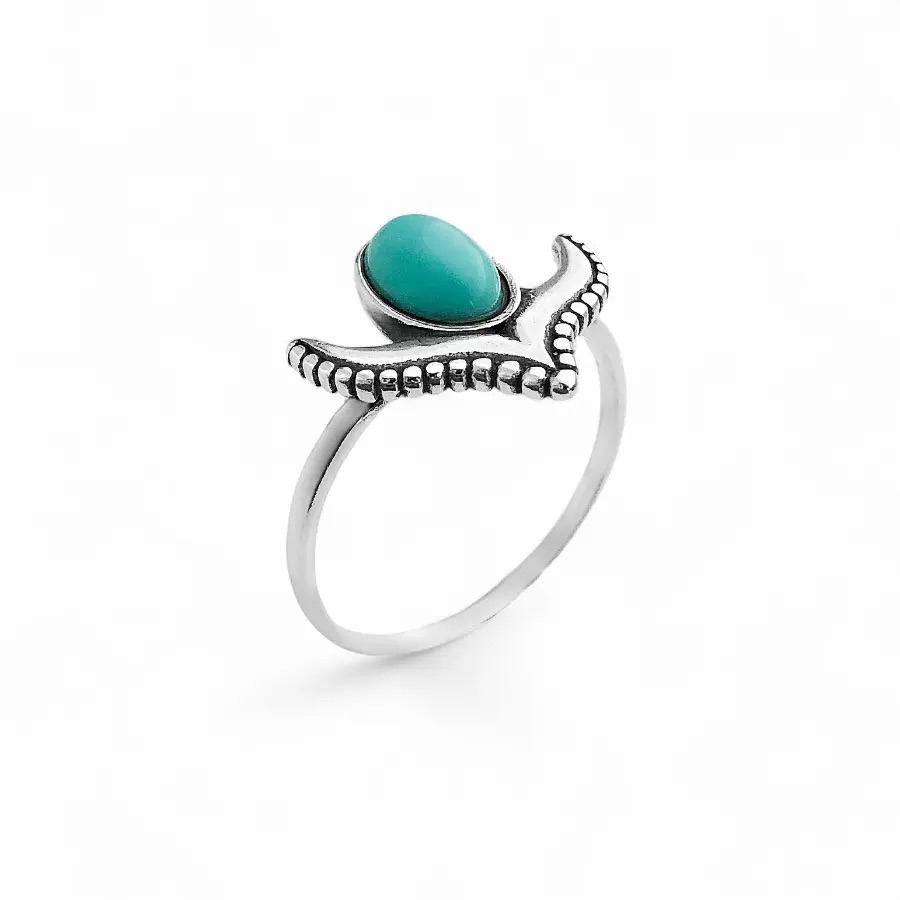 ANEL CAUDA BALEIA TURQUESA TRABALHADO PONTILHADO BOHO RABO SEREIA ENVELHECIDA EM PRATA 925
