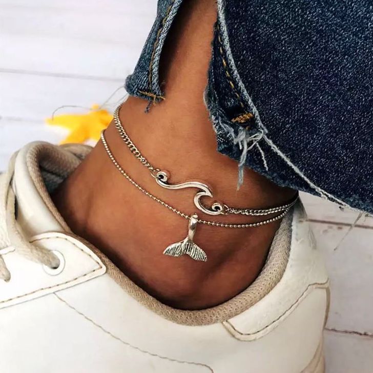 TORNOZELEIRA DUPLA PINGENTE ONDA DO MAR E CAUDA BALEIA